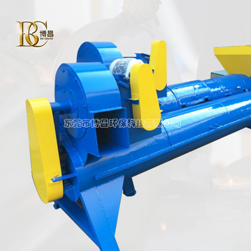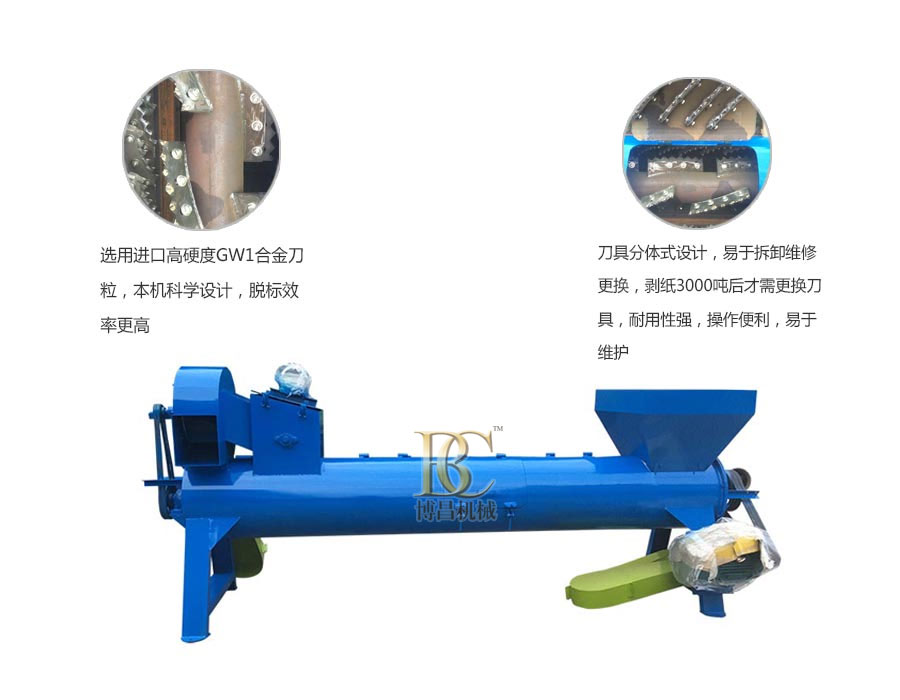 瓶料自入料,主軸上裝有116把合金葉片與主軸中心線有一定的夾角和螺旋線旋轉,將PET瓶向出料端輸送,葉片上的合金刀顆將標簽剝離,出口處有風箱分離室將剝離的標簽與PET瓶身分離,標簽紙從右邊的口吹出,PET瓶直接落下 。